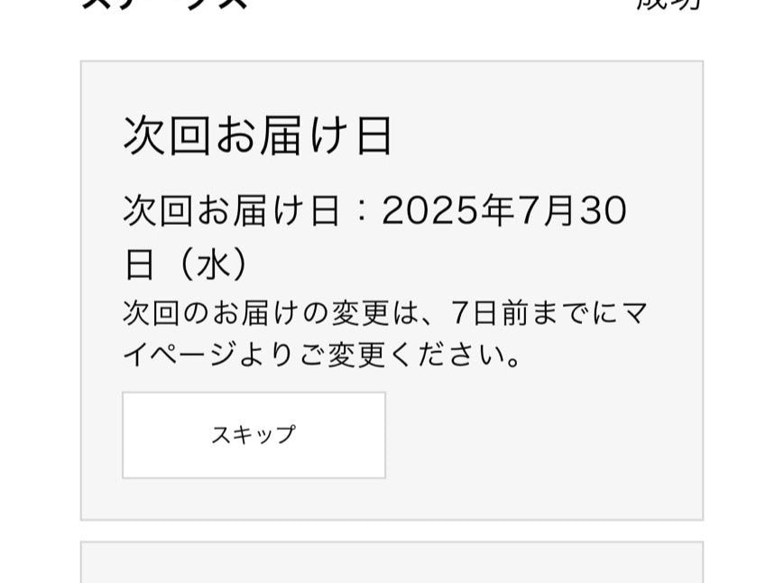 次回お届け日の場所にある「スキップ」ボタンより、ご自身でお届けを1ヶ月スキップできます。